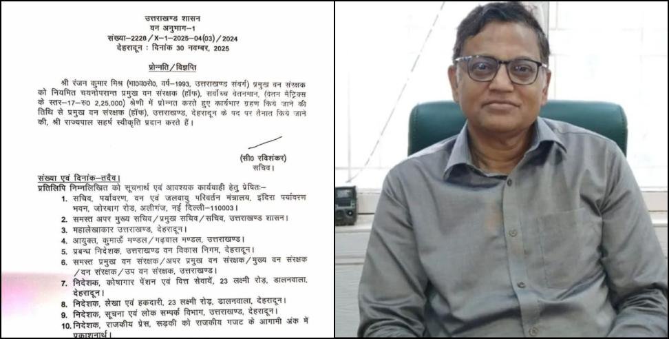 देहरादून: उत्तराखंड के वन विभाग में एक महत्वपूर्ण प्रशासनिक फेरबदल करते हुए पीसीसीएफ (वन्यजीव) रंजन मिश्रा को प्रमुख वन संरक्षक (हॉफ) नियुक्त कर दिया गया है। इस संबंध में वन विभाग के सचिव द्वारा औपचारिक आदेश जारी किए गए हैं। यह नियुक्ति राज्य के वन प्रशासन में एक महत्वपूर्ण बदलाव के रूप में देखी जा रही है।