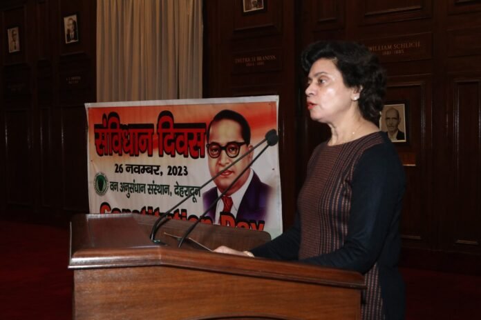 देहरादून। भारत सरकार द्वारा भारत के नागरिकों के बीच संविधान के महत्व का प्रसार करने और डाॅ0 भीमराव अम्बेडकर के विचारों का प्रसार करने के लिए प्रति वर्ष 26 नवम्बर को संविधान दिवस के रूप में मनाने का निणर्य लिया गया है। आज वन अनुसंधान संस्थान के मुख्य भवन के दीक्षान्तगृह में वन अनुसंधान संस्थान निदेशक, डा0 रेनू सिंह ने भारत के संविधान की उ६ेशिका का संस्थान कमिर्यों के समक्ष उल्लेख किया व इसके अनुपालन की शपथ दिलाई। इस अवसर पर संस्थान के अधिकारी, वैज्ञानिक व कमर्चारी मौजूद थे।