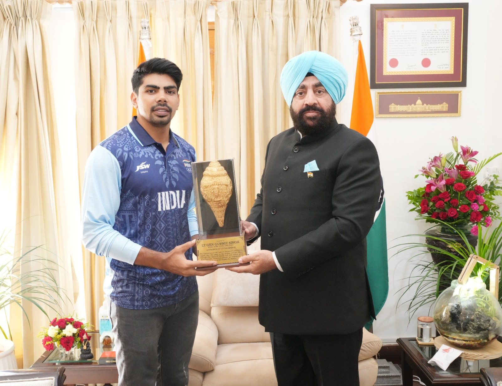 देहरादून। राज्यपाल लेफ्टिनेंट जनरल गुरमीत सिंह (से नि) से शनिवार को राजभवन में भारतीय कबड्डी टीम के कप्तान पवन सहरावत ने शिष्टाचार भेंट की। हाल ही में चीन में सम्पन्न हुए एशियाई खेलों में उनकी कप्तानी में भारत ने स्वर्ण पदक जीता है, जिसके लिए राज्यपाल ने बधाई दी और उन्हें स्मृति चिन्ह देकर सम्मानित किया। राज्यपाल ने कहा कि वे हमारे युवाओं के लिए प्रेरणास्रोत हैं। उन्होंने कहा कि हम सभी को अपने खिलाड़ियों पर गर्व है कि उनके उत्कृष्ट खेल से इस वर्ष एशियाई खेलों में रिकॉर्ड 107 मेडल जीते हैं। राज्यपाल ने कहा कि उत्तराखण्ड के युवाओं में कबड्डी खेल में बेहतर करने की संभावनाएं हैं। युवाओं को इस प्रकार के खिलाड़ियों से सीख लेने की जरूरत है। इस अवसर पर राज्यपाल ने उनके उज्ज्वल भविष्य के लिए शुभकामनाएं दी।