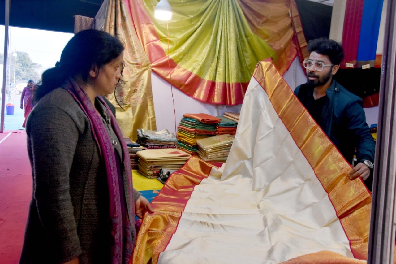 देहरादून। स्टेट हैंडलूम एक्सपो कांजीवरम साड़ी जिसमें अनेक प्रकार की सुंदर साड़ियों बेंगलूर, तमिलनाडु, कर्नाटका से लाए हैं। इनके पास कांजीवरम, मयसूर सिल्क, उपदा सिल्क, बैंगलुरु सिल्क, आदि जैसे साड़ियां हैं। जिनका मूल्य 2000 रुपए से 2.50 लाख तक होता हैं। इनके पास विभिन्न प्रकार की साड़ियों का वेडिंग कलेक्शन भी हैं और इनको बेस्ट वीवर कलेक्शन के लेए 2010 में राष्ट्र पुरुष्कर भी प्राप्त हुआ। लोगों ने इनकी साड़ियों को खूब पसंद किया। हमनें देखा कि गुजरात, मुंबई, बैंगलोर सहित अन्य स्थानों पर भी जब हम गए तो लोगों के सिर पर उत्तराखंड की टोपी थी और उस पर ब्रह्मकमल का चिन्ह बना हुआ हैं। यहाँ पर एक स्टाल पंजाबी जूतियों का भी हैं जो की पंजाब से आ रखा हैं। यहाँ पर कही प्रकार की पंजाबी डिजाइनर जूतियाँ हैं जो की उचित दर में मिल रही हैं, जिसका मूल्य 200 रुपए से 500 रुपए तक हैं जिसका लोग आनंद उठा रहें हैं। इसकी डिजाइनिंग करने में 7 लोग काम करते हैं जो की उनकें पारिवारिक सदस्य हैं। इस मेले में निदेशक उद्योग मृत्युंजय सिंह, सयुक्त निदेशक उद्योग एमएस सजवाण, उप निर्देशक उद्योग राजेंद्र कुमार, निदेशक उद्योग अनुपम द्विवेदी, निदेशक उद्योग कर्मचारी अधिकारी एवं मेला अधिकारी प्रदीप नेगी आदि उपस्थित थे।