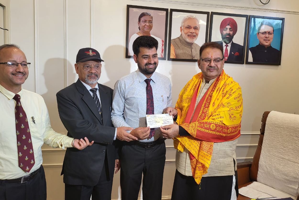 देहरादून। सैनिक कल्याण मंत्री गणेश जोशी से शनिवार को कैंप कार्यालय में वन्दे मातरम ट्रेनिंग एण्ड एजुकेशन फाउण्डेशन के संस्थापक पूर्व सैनिक राजेश सेमवाल ने मुलाकात की और संस्था द्वारा किए जा रहे कार्यों को सैनिक कल्याण मंत्री गणेश जोशी को अवगत कराया। मंत्री गणेश जोशी ने संस्था द्वारा किए जा रहे कार्यों की प्रसंशा व्यक्त की और संस्था के अध्यक्ष को आर्थिक सहायता के तौर पर 02 लाख रुपए का चेक भेंट किया।